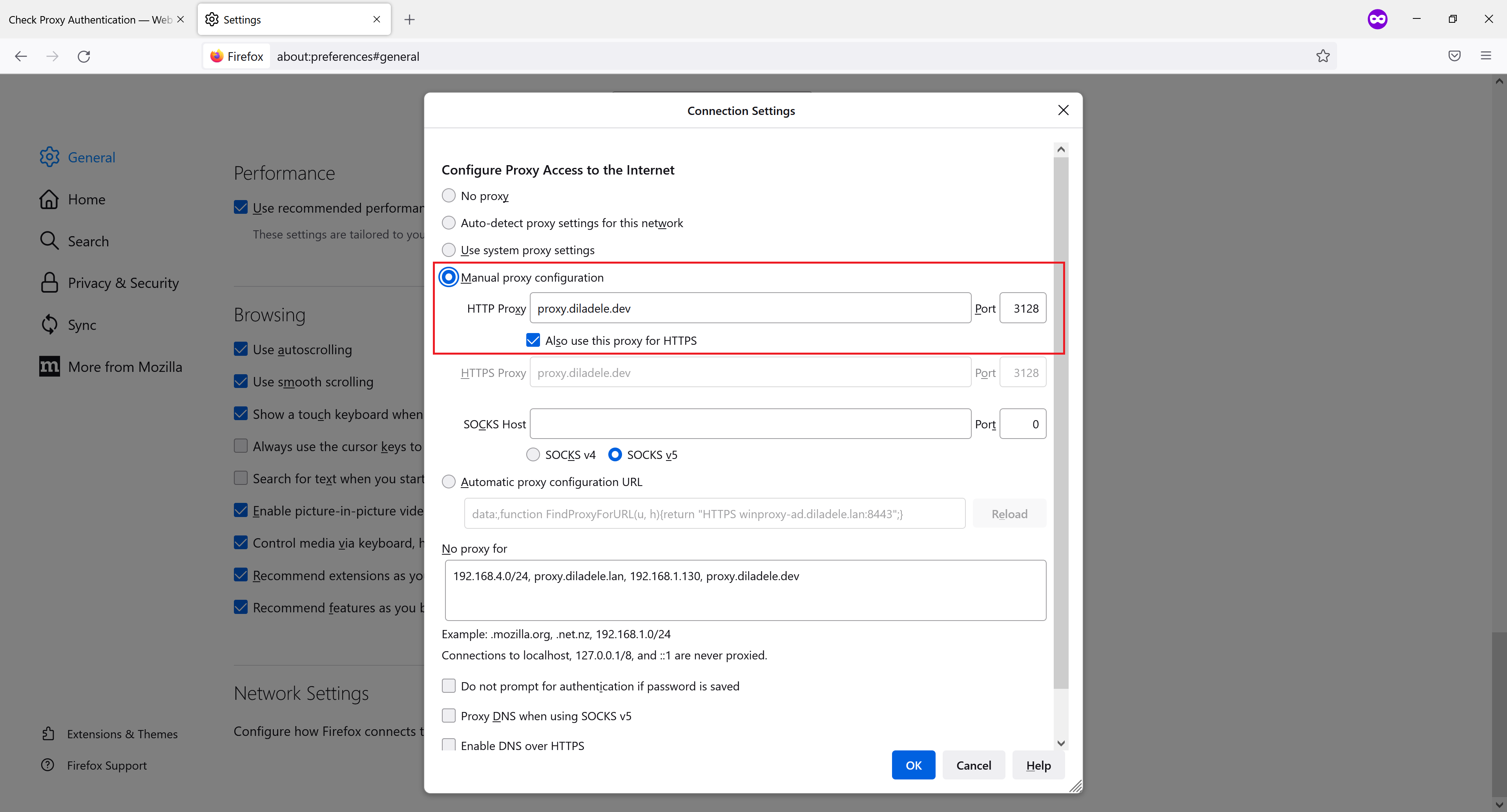 To check if our Google Workspace authentication works correctly, configure your browser to use your proxy on proxy.diladele.dev port 3128 (adjust for your proxy name of course) and navigate to some URL.